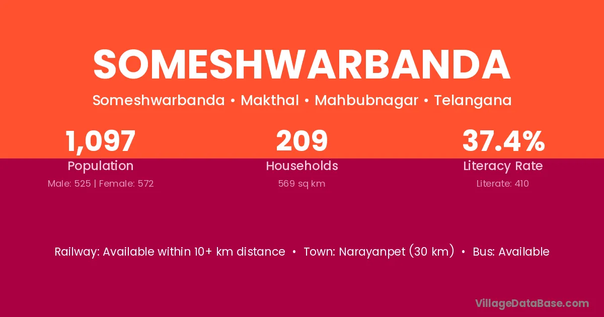 Narayanpet (30 km) is the nearest town to Someshwarbanda village for major economic activities and is located approximately 30 km away.