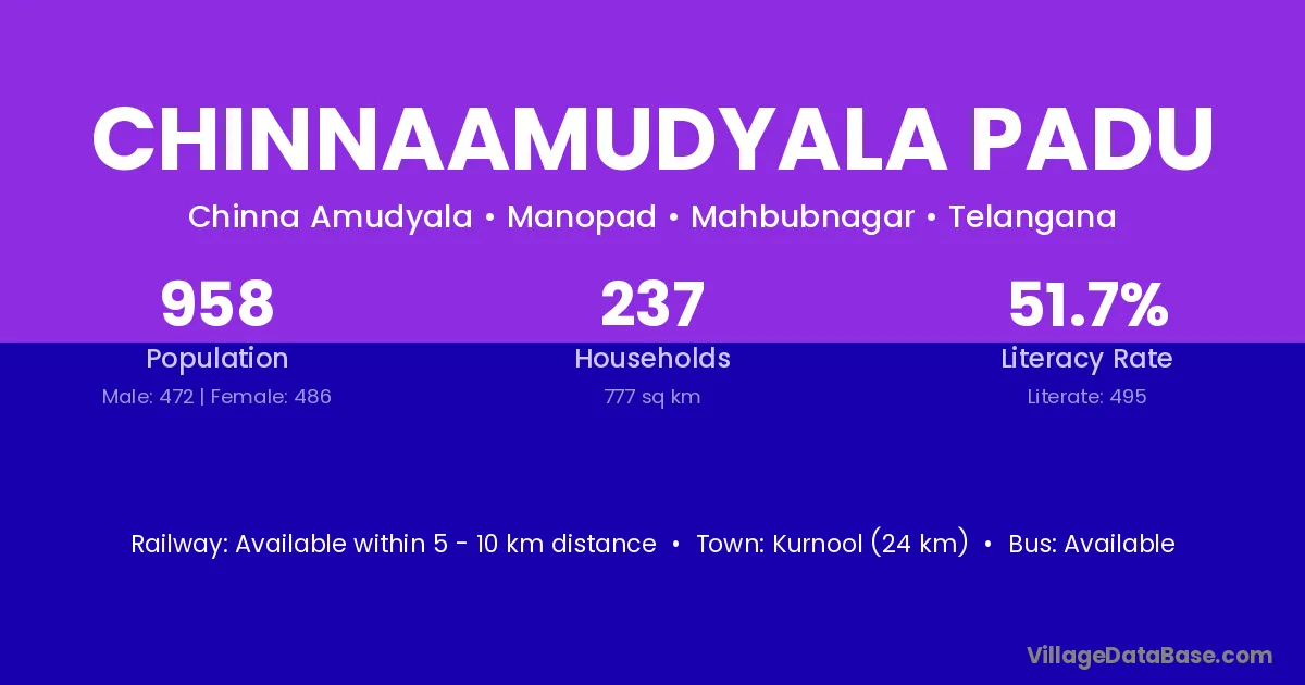 Chinnaamudyala Padu village has a total population of 958 people, of which 472 are males and 486 are females.