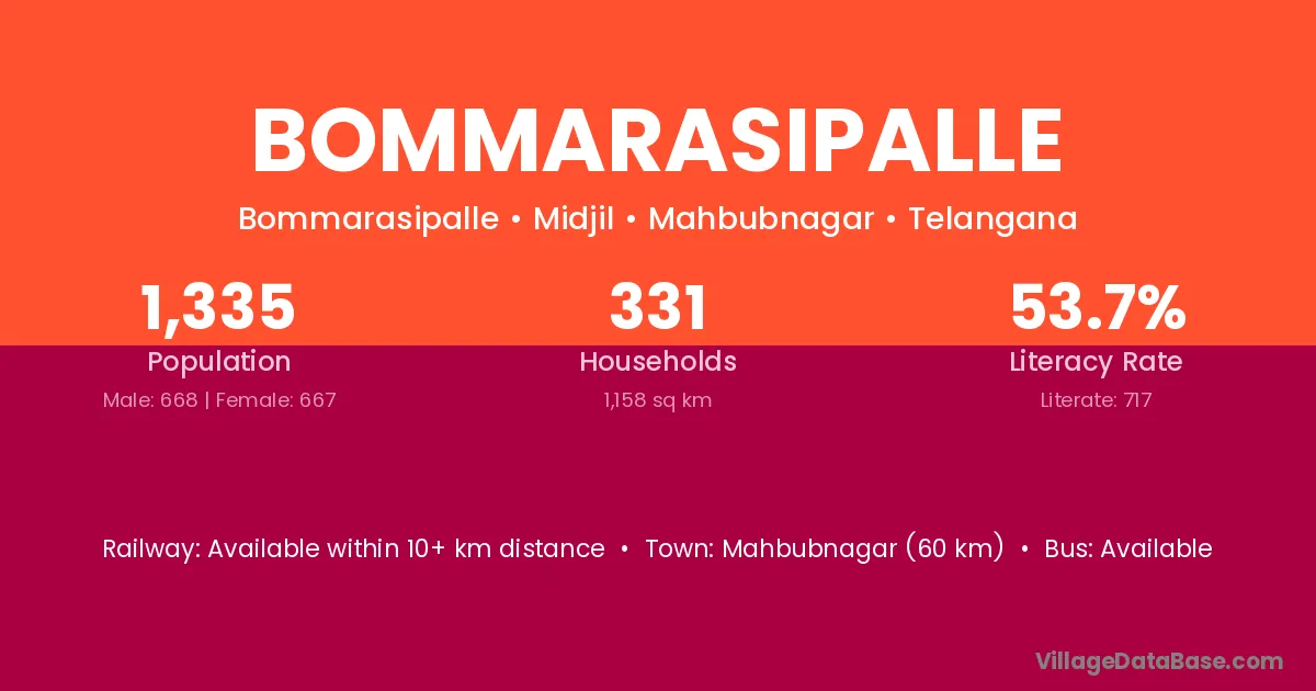Mahbubnagar (60 km) is the nearest town to Bommarasipalle village for major economic activities and is located approximately 60 km away.