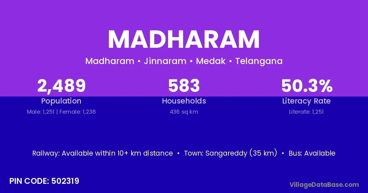 Mahbubnagar (52 km) is the nearest town to Madharam village for major economic activities and is located approximately 52 km away.