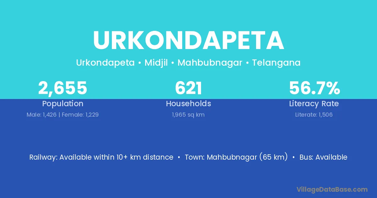 Mahbubnagar (65 km) is the nearest town to Urkondapeta village for major economic activities and is located approximately 65 km away.