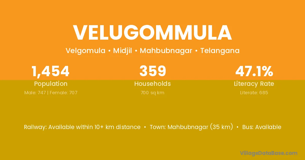 Mahbubnagar (35 km) is the nearest town to Velugommula village for major economic activities and is located approximately 35 km away.