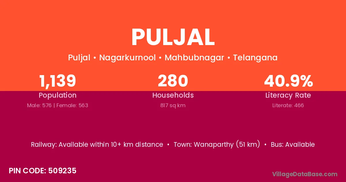 Wanaparthy (51 km) is the nearest town to Puljal village for major economic activities and is located approximately 51 km away.