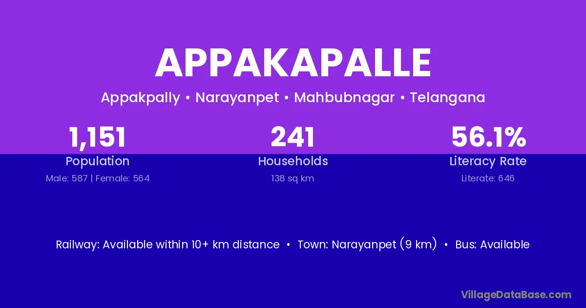 Narayanpet (9 km) is the nearest town to Appakapalle village for major economic activities and is located approximately 9 km away.