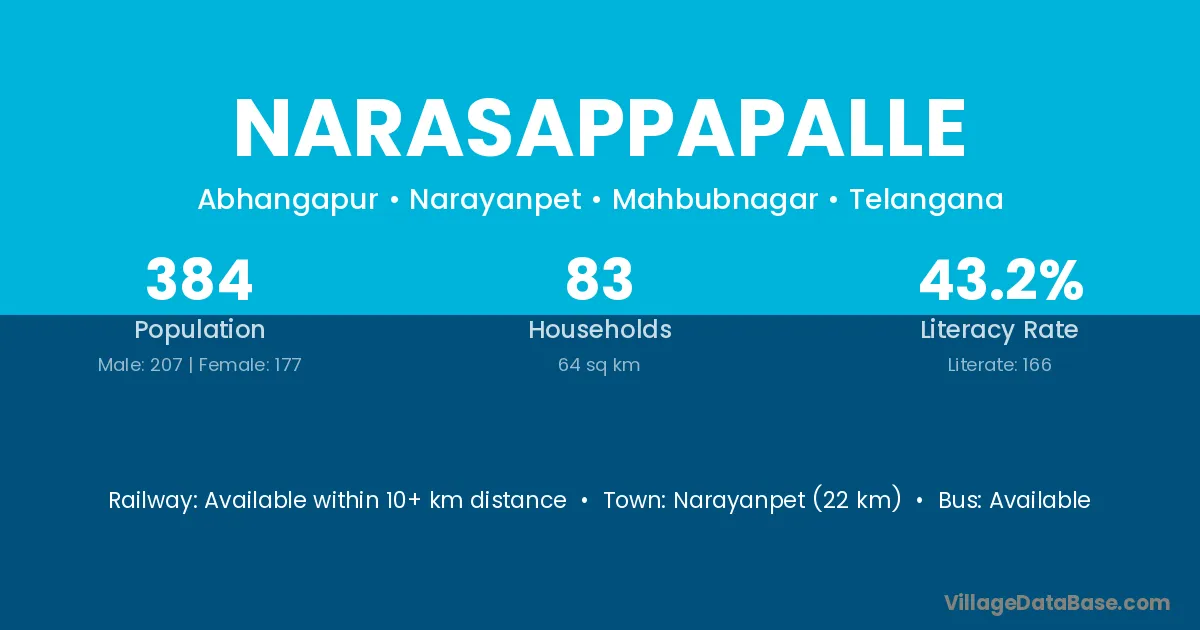 Narayanpet (22 km) is the nearest town to Narasappapalle village for major economic activities and is located approximately 22 km away.