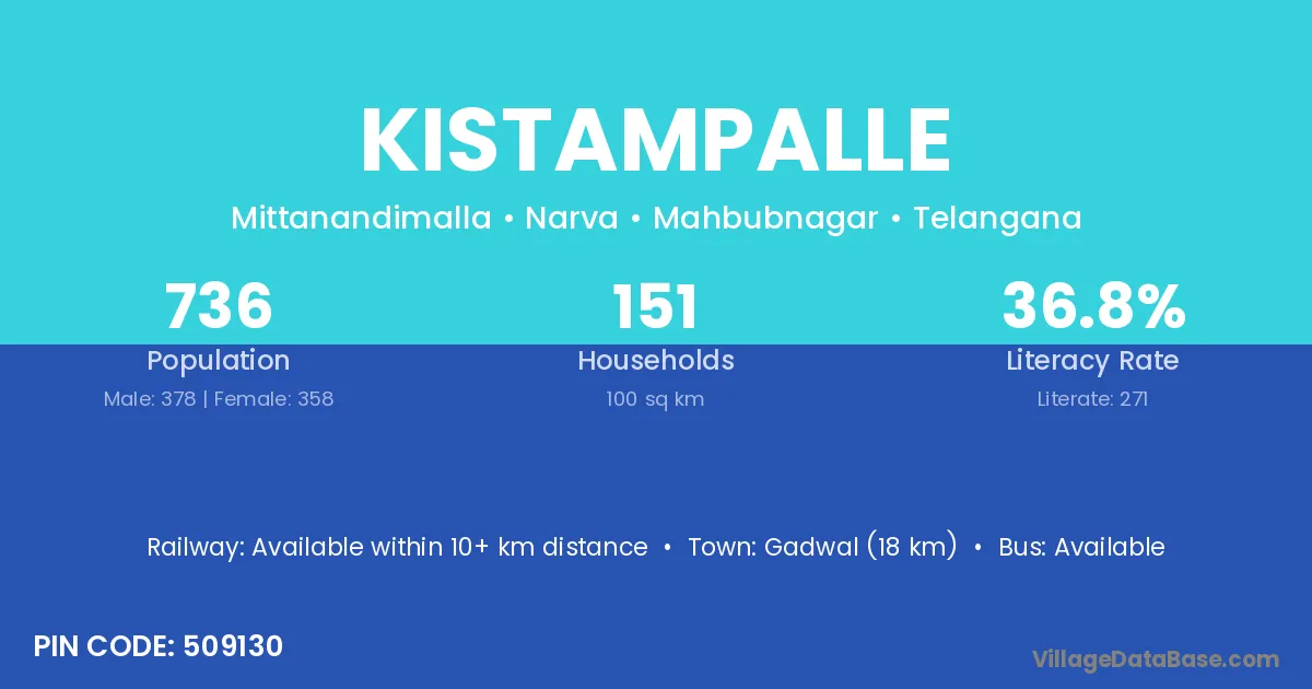 Gadwal (18 km) is the nearest town to Kistampalle village for major economic activities and is located approximately 18 km away.