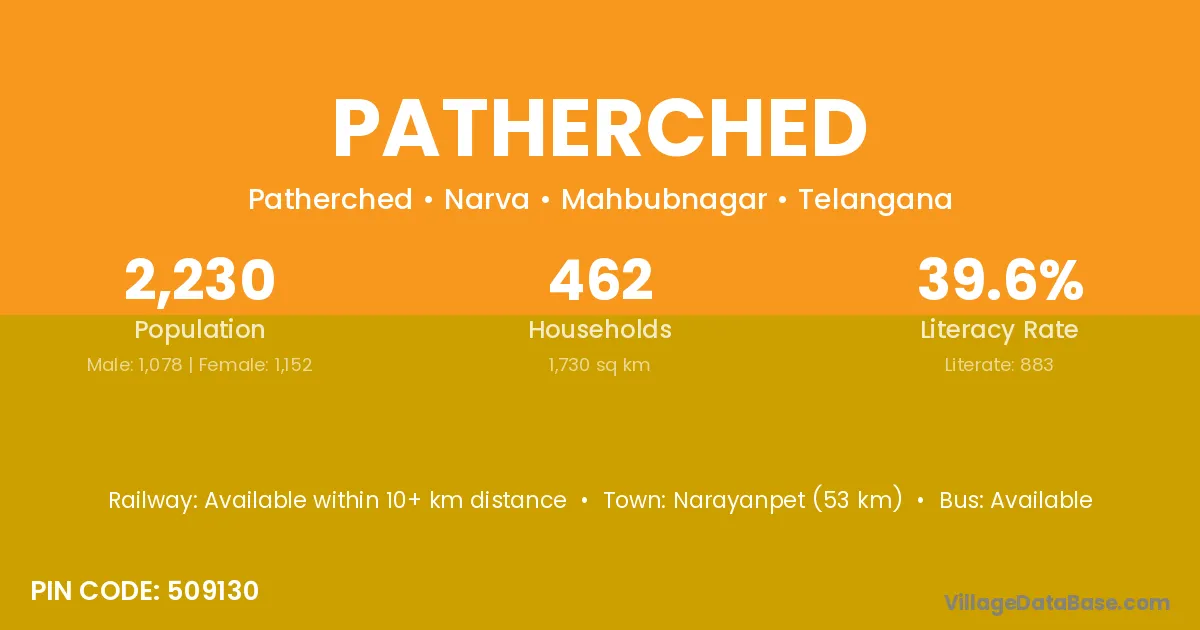 Narayanpet (53 km) is the nearest town to Patherched village for major economic activities and is located approximately 53 km away.