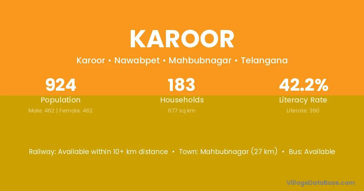 Mahbubnagar (27 km) is the nearest town to Karoor village for major economic activities and is located approximately 27 km away.