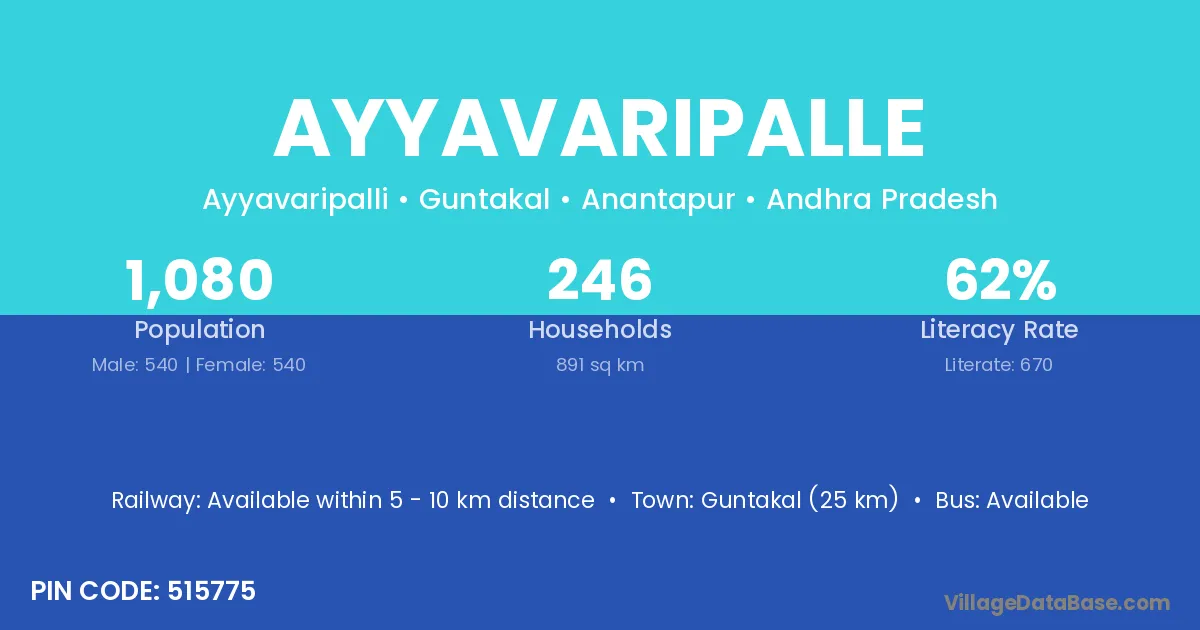 Ayyavaripalle village has a total population of 2,171 people, of which 1,134 are males and 1,037 are females.
