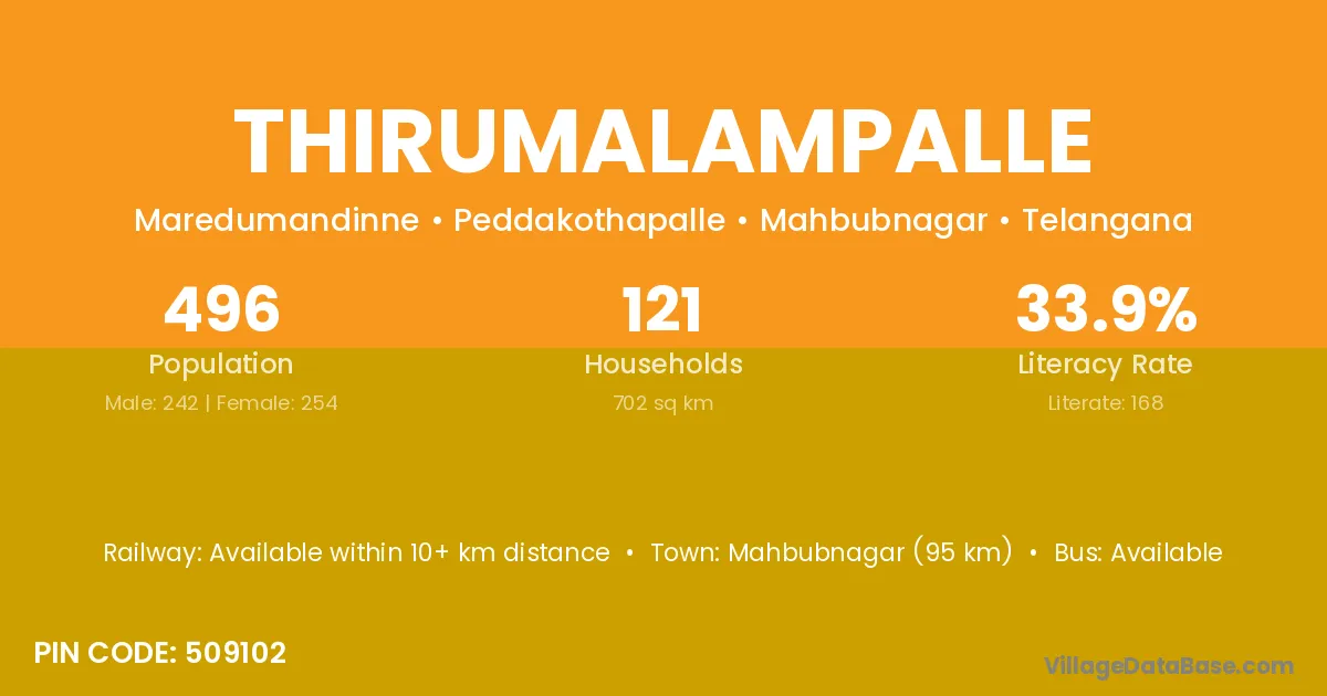 Mahbubnagar (95 km) is the nearest town to Thirumalampalle village for major economic activities and is located approximately 95 km away.