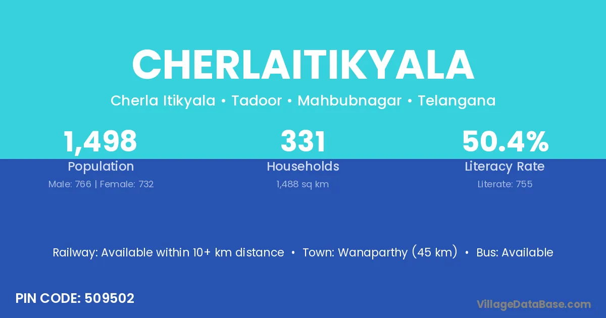 Wanaparthy (45 km) is the nearest town to Cherlaitikyala village for major economic activities and is located approximately 45 km away.