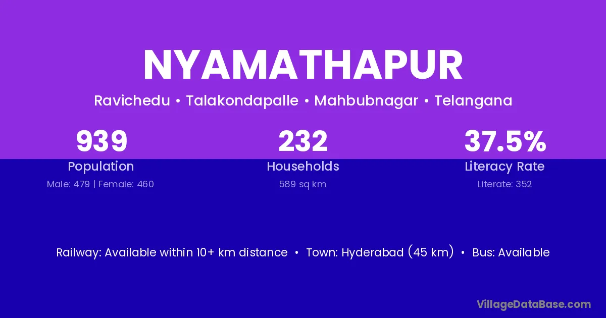 Hyderabad (45 km) is the nearest town to Nyamathapur village for major economic activities and is located approximately 45 km away.