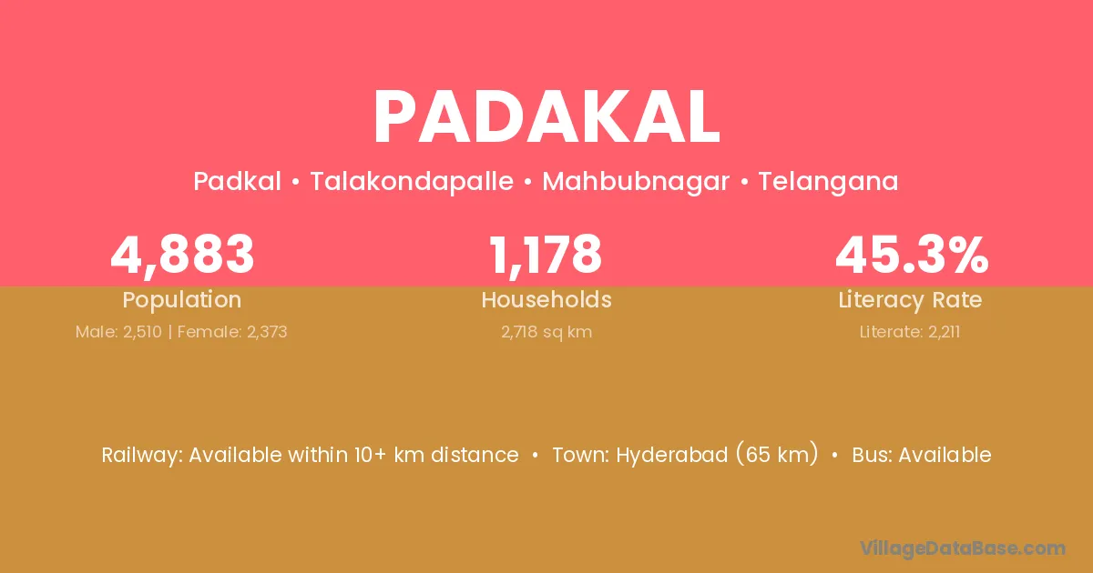 Hyderabad (65 km) is the nearest town to Padakal village for major economic activities and is located approximately 65 km away.