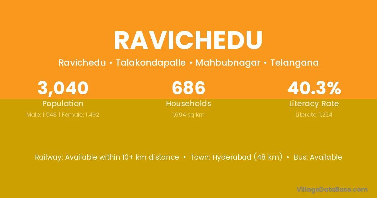 Ravichedu village has a total population of 3,040 people, of which 1,548 are males and 1,492 are females.