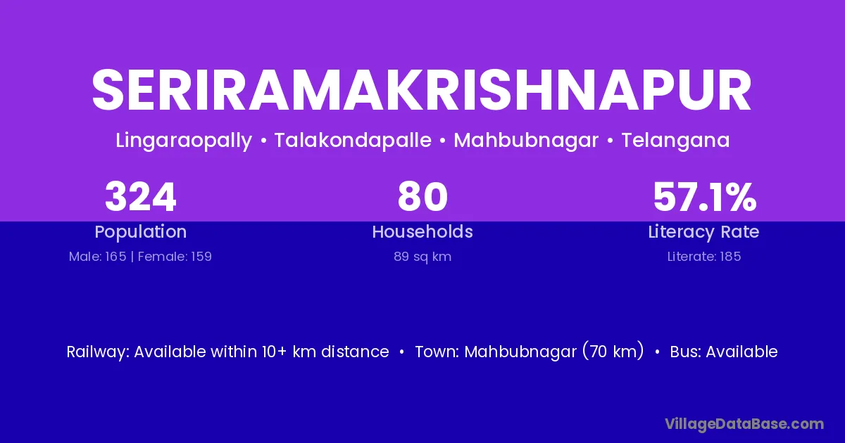 Mahbubnagar (70 km) is the nearest town to Seriramakrishnapur village for major economic activities and is located approximately 70 km away.