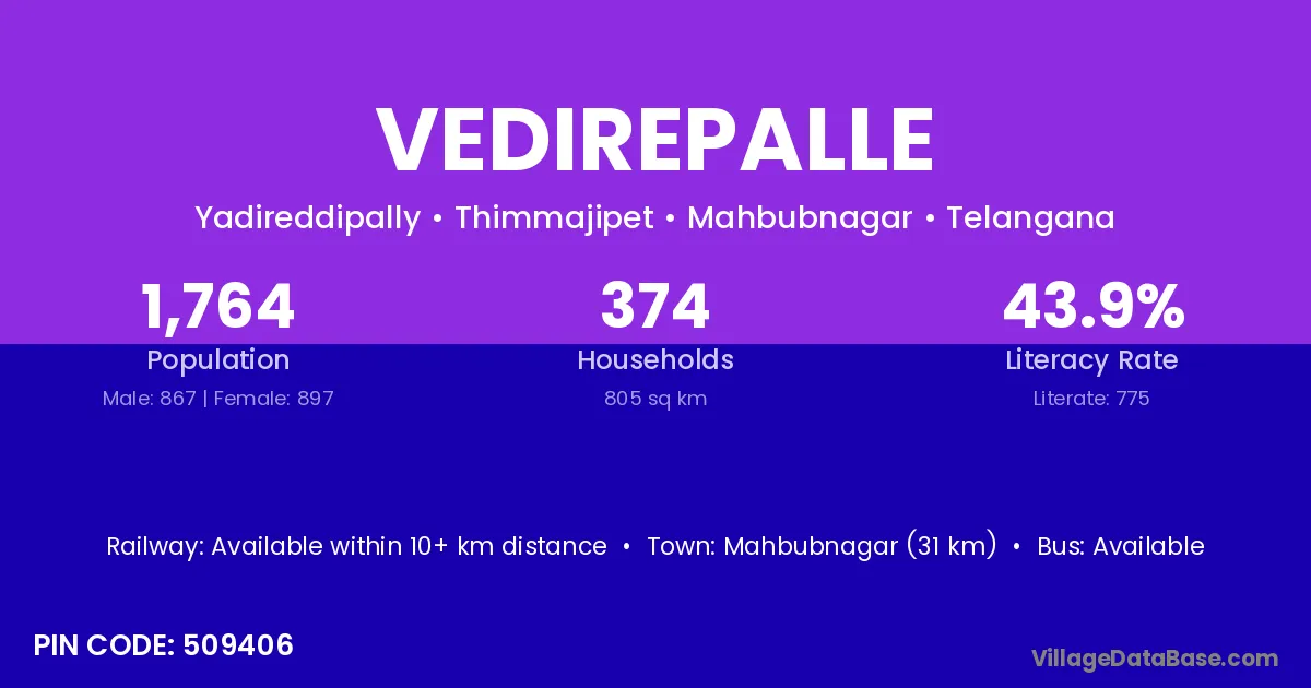Mahbubnagar (31 km) is the nearest town to Vedirepalle village for major economic activities and is located approximately 31 km away.