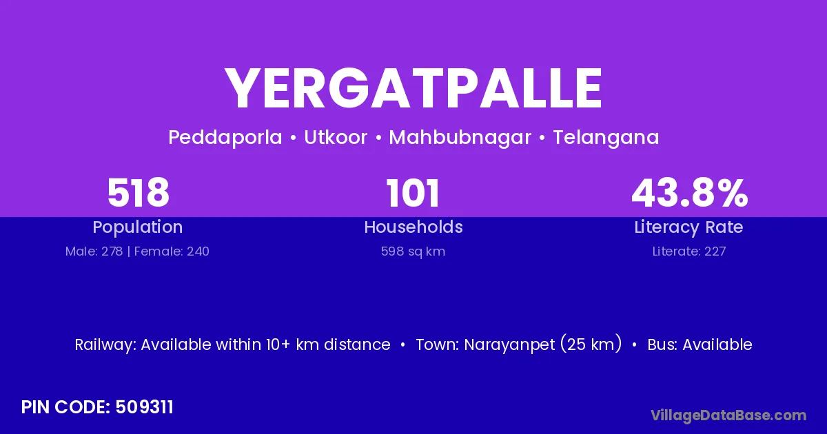 Narayanpet (25 km) is the nearest town to Yergatpalle village for major economic activities and is located approximately 25 km away.
