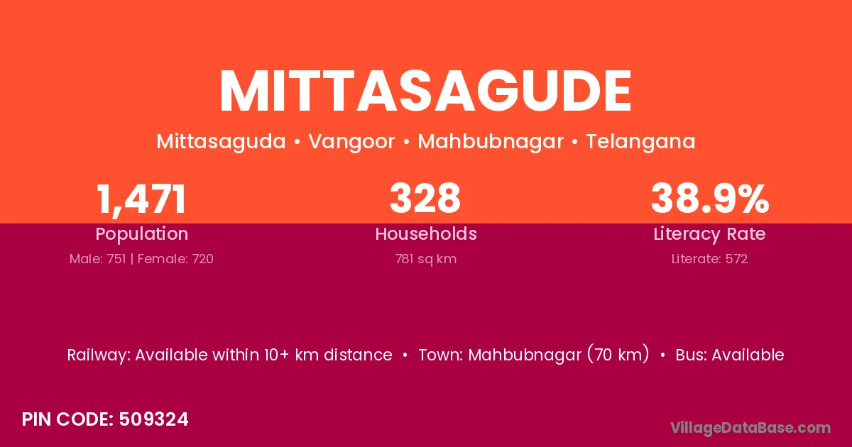 Mahbubnagar (70 km) is the nearest town to Mittasagude village for major economic activities and is located approximately 70 km away.