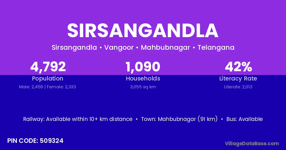 Mahbubnagar (91 km) is the nearest town to Sirsangandla village for major economic activities and is located approximately 91 km away.