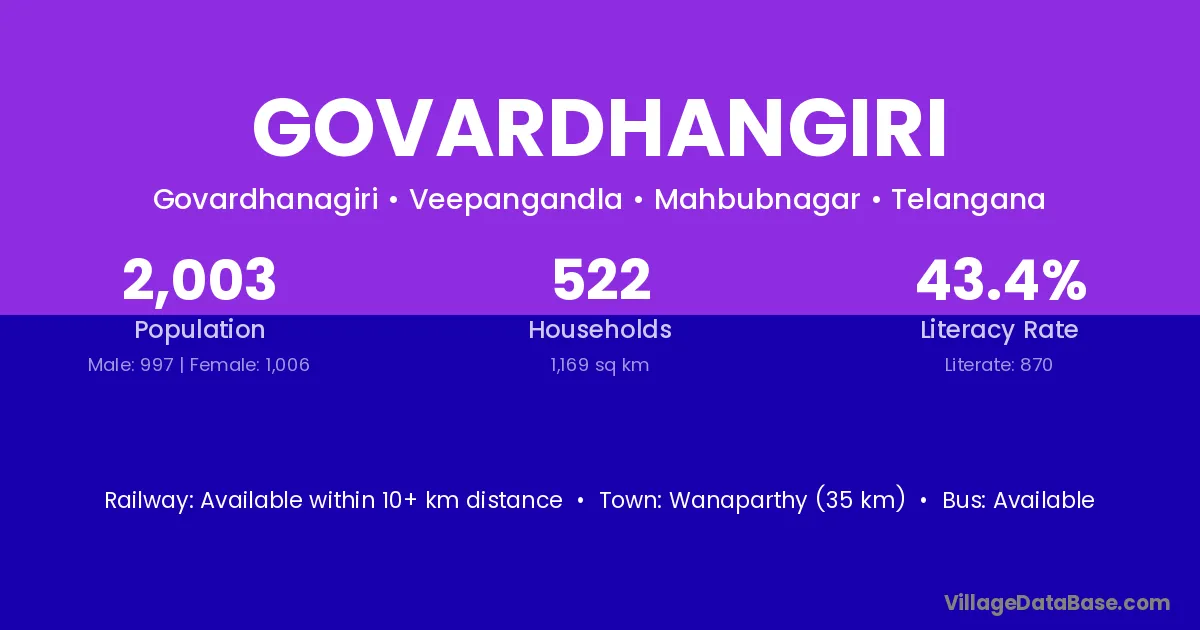 Wanaparthy (35 km) is the nearest town to Govardhangiri village for major economic activities and is located approximately 35 km away.
