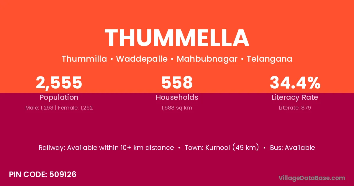 Kurnool (49 km) is the nearest town to Thummella village for major economic activities and is located approximately 49 km away.