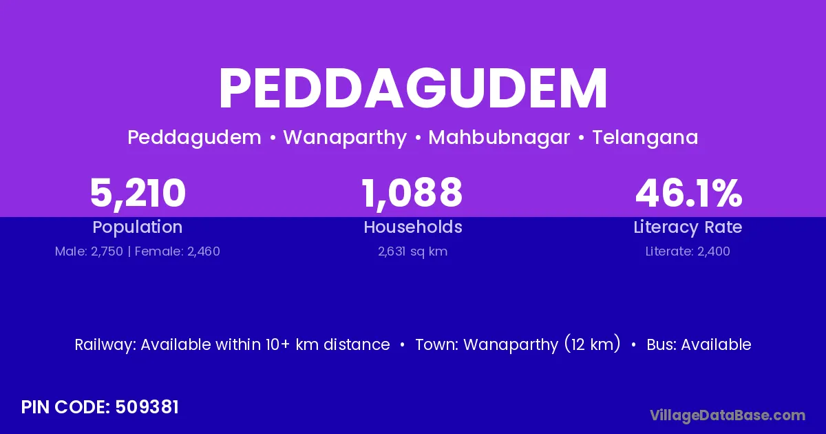 Wanaparthy (12 km) is the nearest town to Peddagudem village for major economic activities and is located approximately 12 km away.