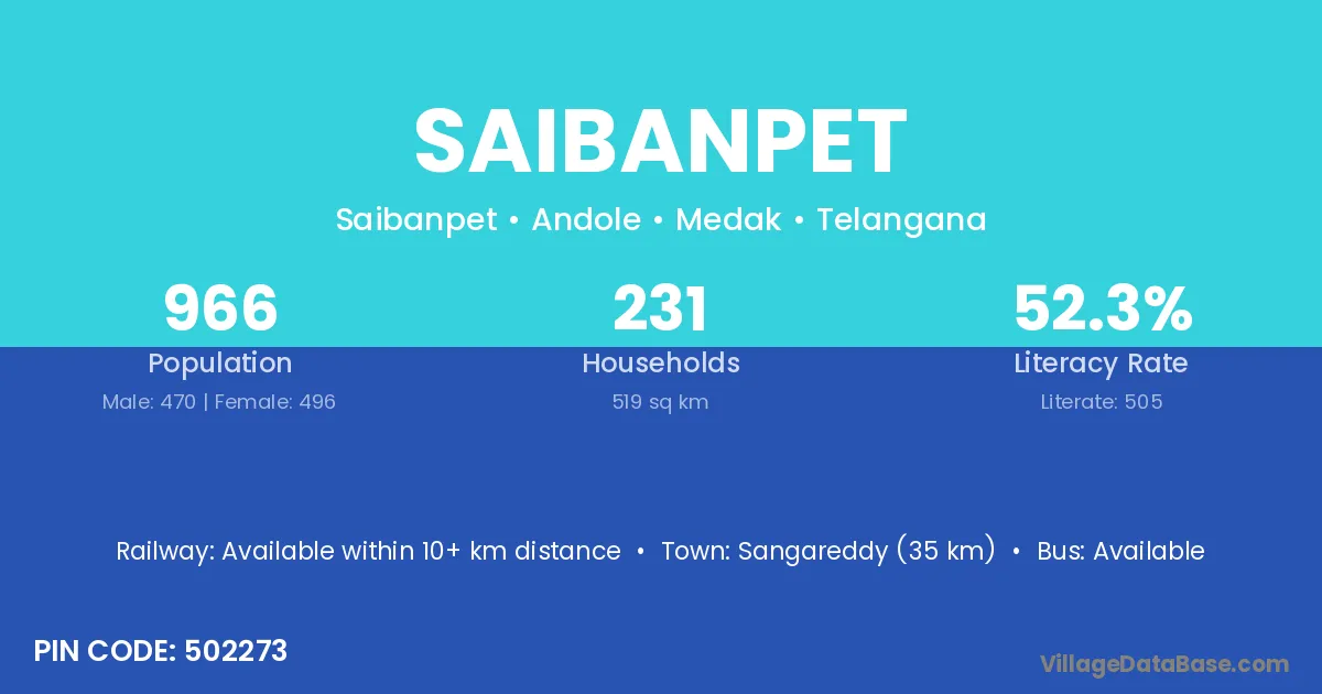 Sangareddy (35 km) is the nearest town to Saibanpet village for major economic activities and is located approximately 35 km away.
