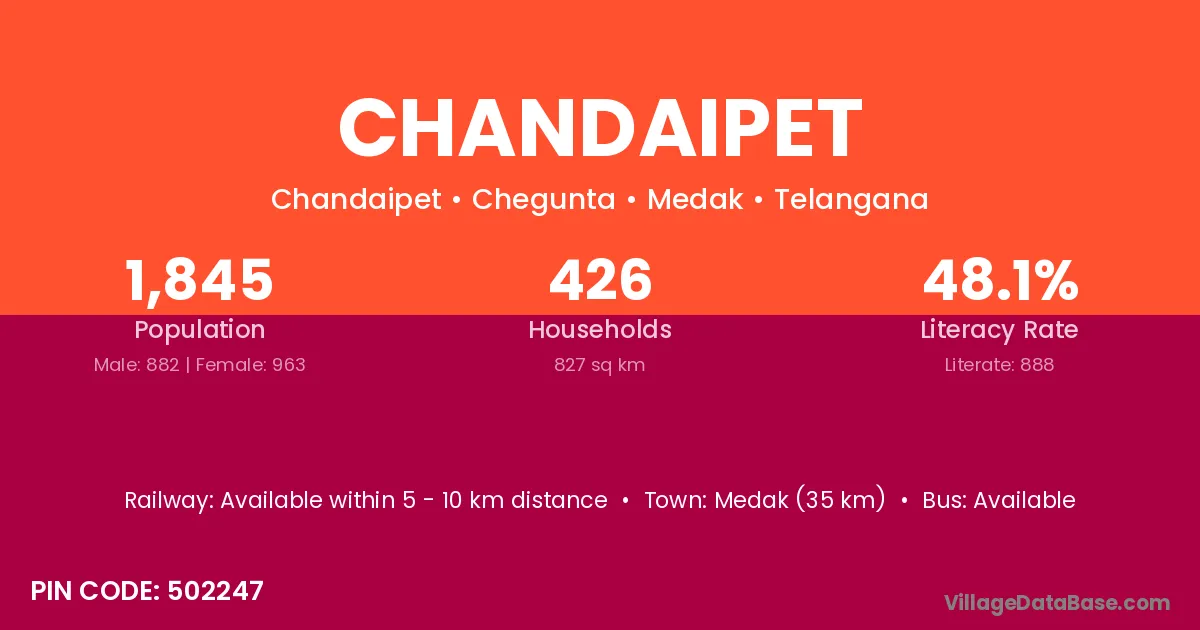 Medak (35 km) is the nearest town to Chandaipet village for major economic activities and is located approximately 35 km away.