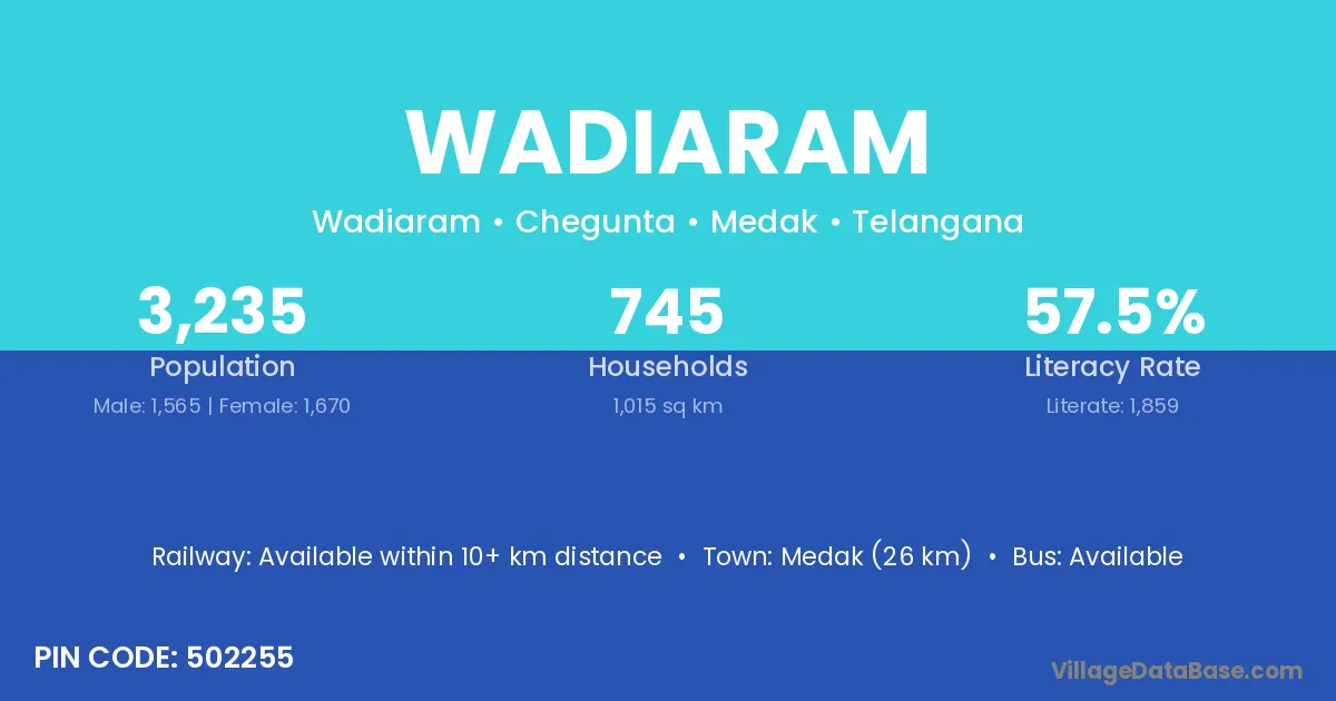 Medak (26 km) is the nearest town to Wadiaram village for major economic activities and is located approximately 26 km away.
