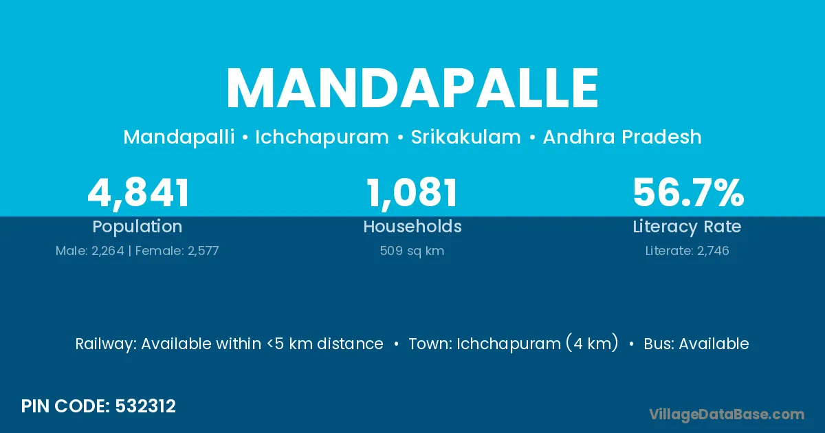Mandapalle village has a total population of 1,997 people, of which 958 are males and 1,039 are females.