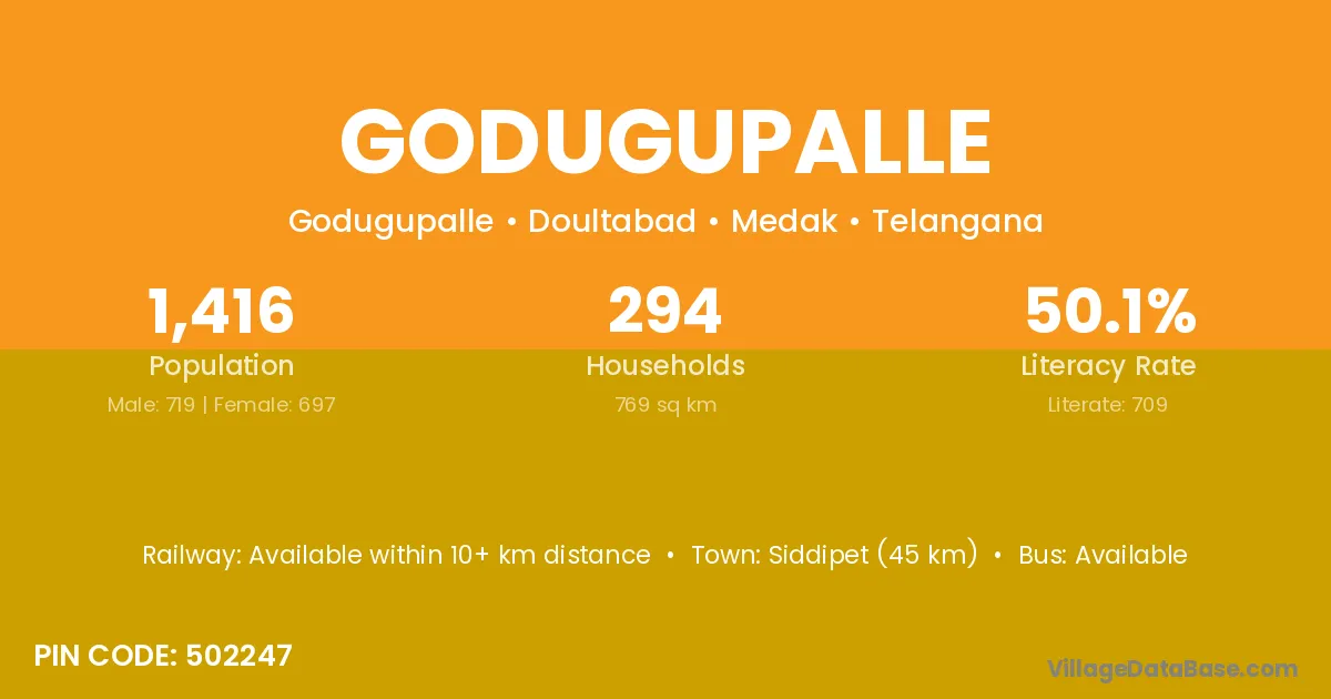 Siddipet (45 km) is the nearest town to Godugupalle village for major economic activities and is located approximately 45 km away.