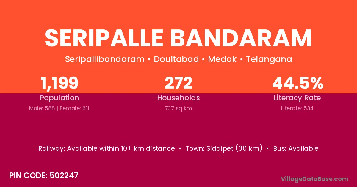 Seripalle Bandaram village has a total population of 1,199 people, of which 588 are males and 611 are females.