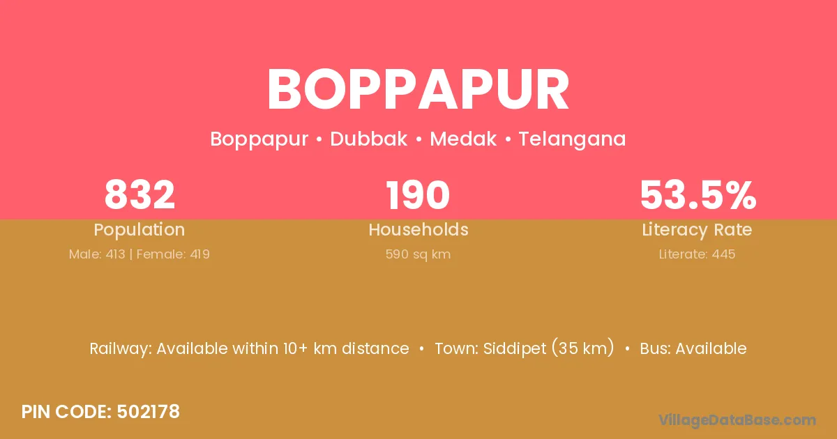 Siddipet (35 km) is the nearest town to Boppapur village for major economic activities and is located approximately 35 km away.