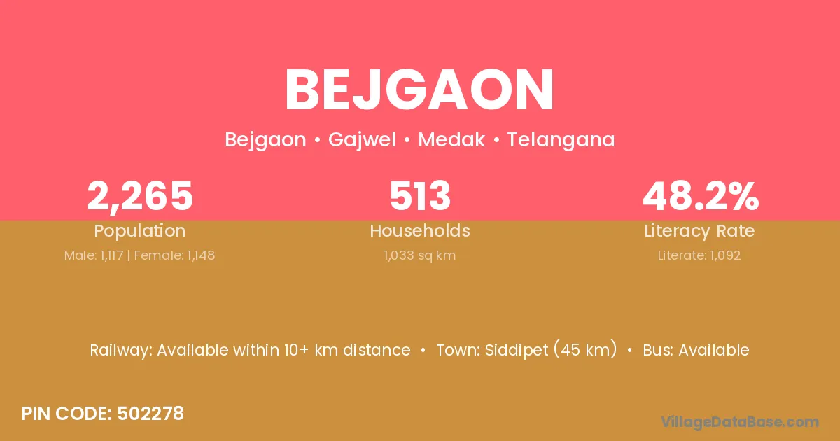 Siddipet (45 km) is the nearest town to Bejgaon village for major economic activities and is located approximately 45 km away.