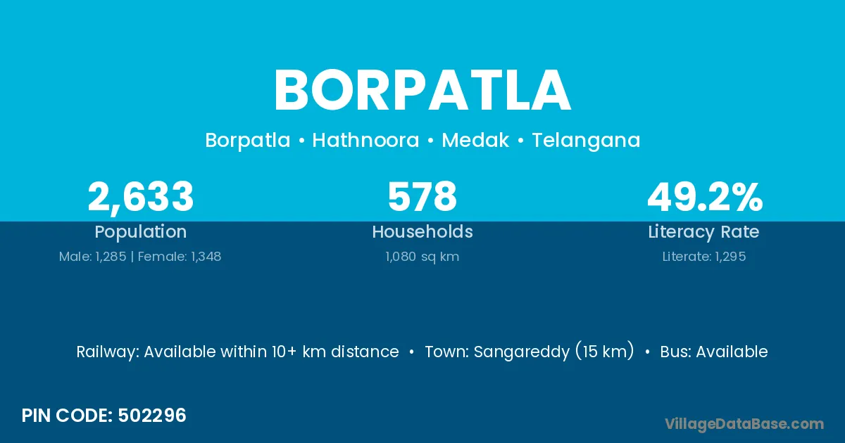 Sangareddy (15 km) is the nearest town to Borpatla village for major economic activities and is located approximately 15 km away.