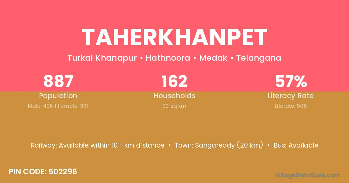 Sangareddy (20 km) is the nearest town to Taherkhanpet village for major economic activities and is located approximately 20 km away.