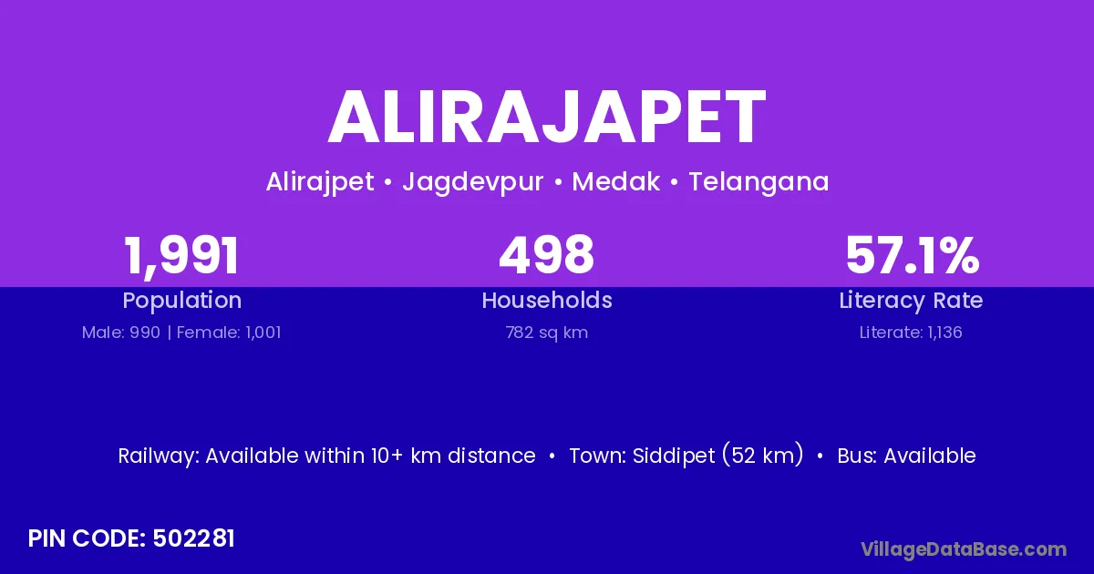 Siddipet (52 km) is the nearest town to Alirajapet village for major economic activities and is located approximately 52 km away.