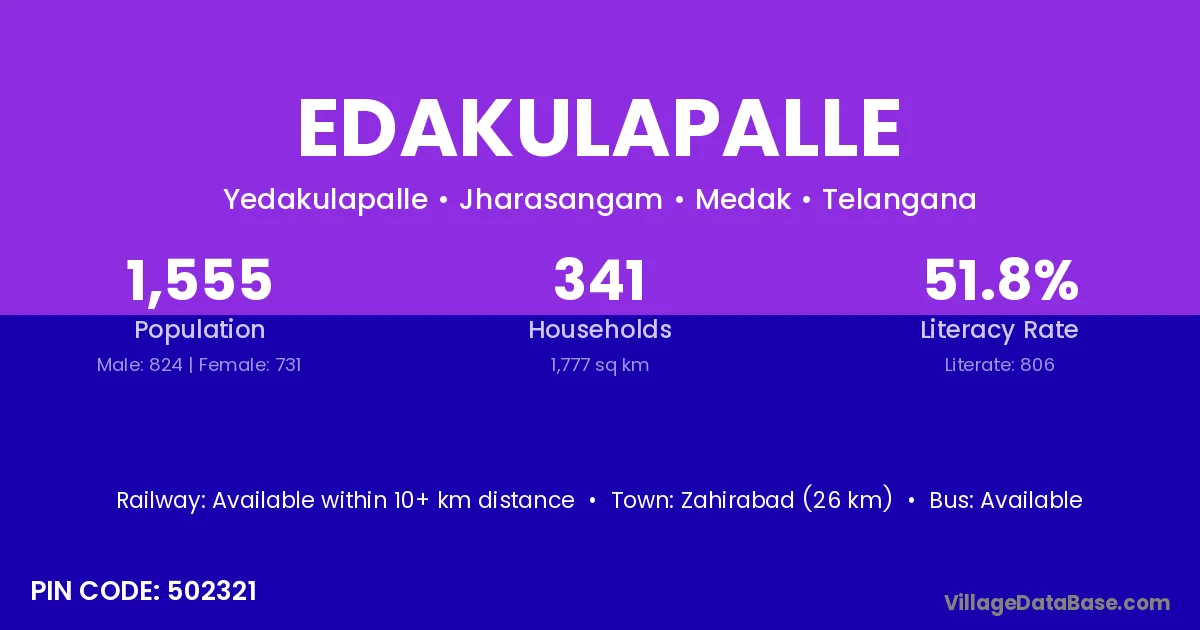 Zahirabad (26 km) is the nearest town to Edakulapalle village for major economic activities and is located approximately 26 km away.