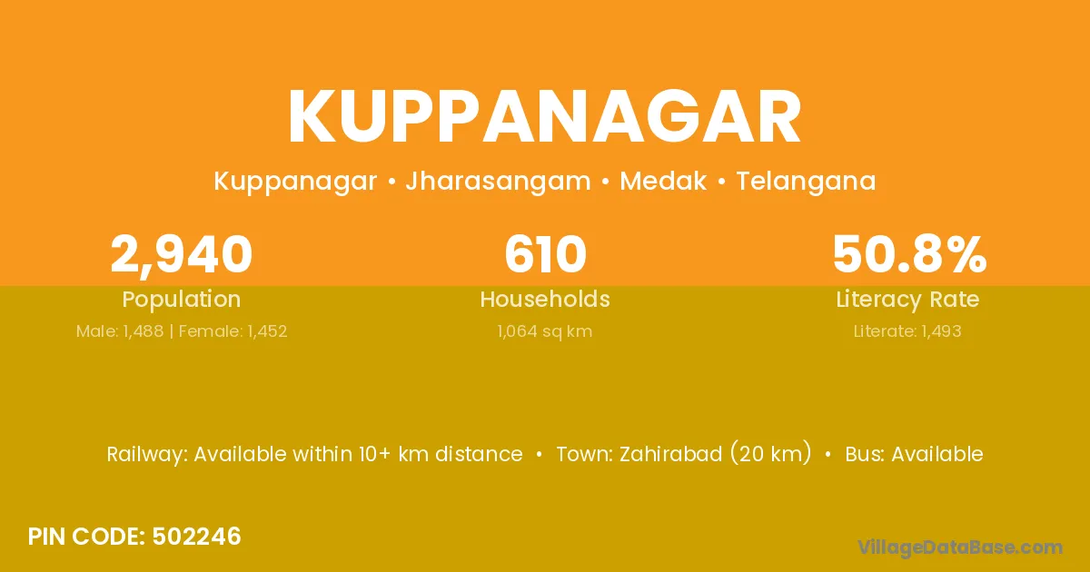 Zahirabad (20 km) is the nearest town to Kuppanagar village for major economic activities and is located approximately 20 km away.
