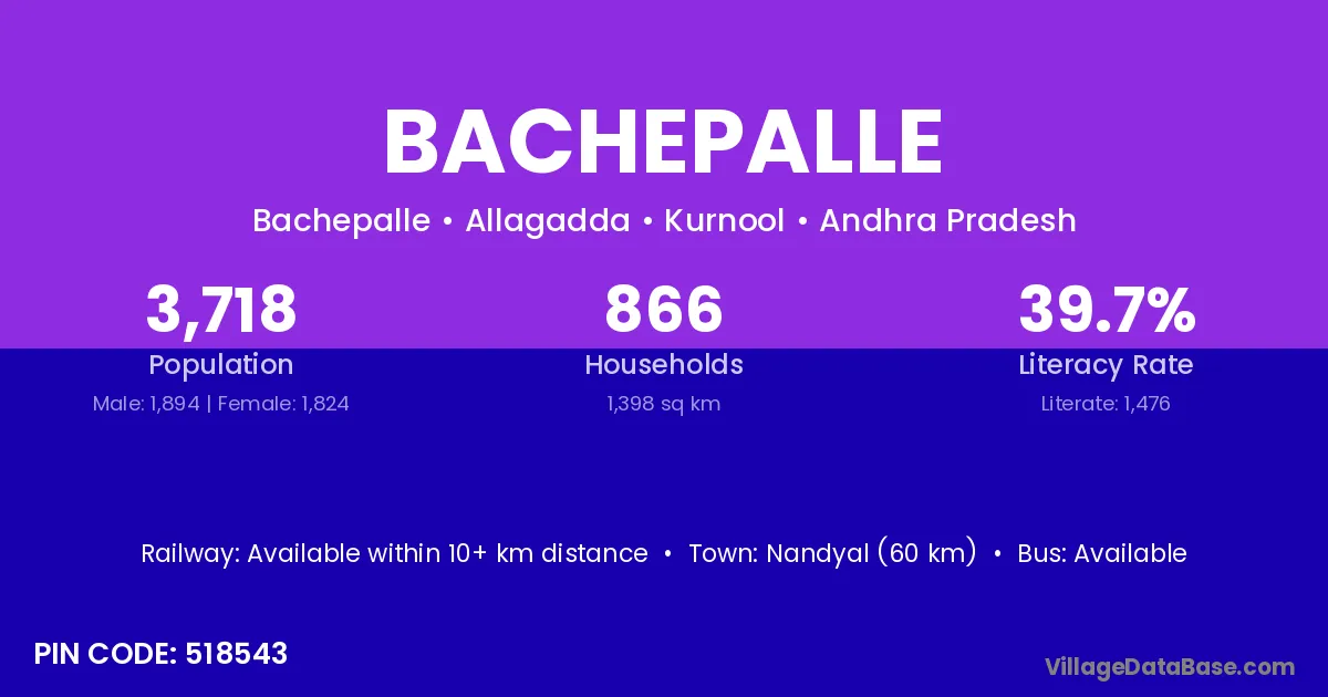 The literacy rate of Bachepalle village is 39.42%. Male literacy stands at 48.64% and female literacy at 30.26%.