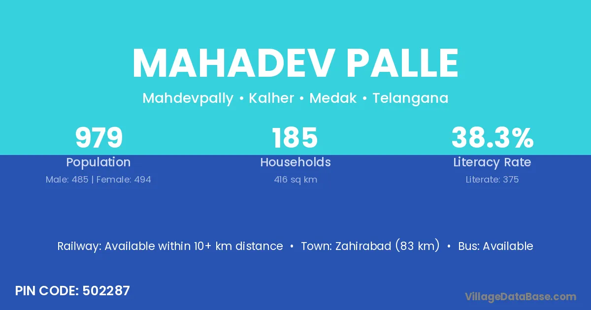 Zahirabad (83 km) is the nearest town to Mahadev Palle village for major economic activities and is located approximately 83 km away.