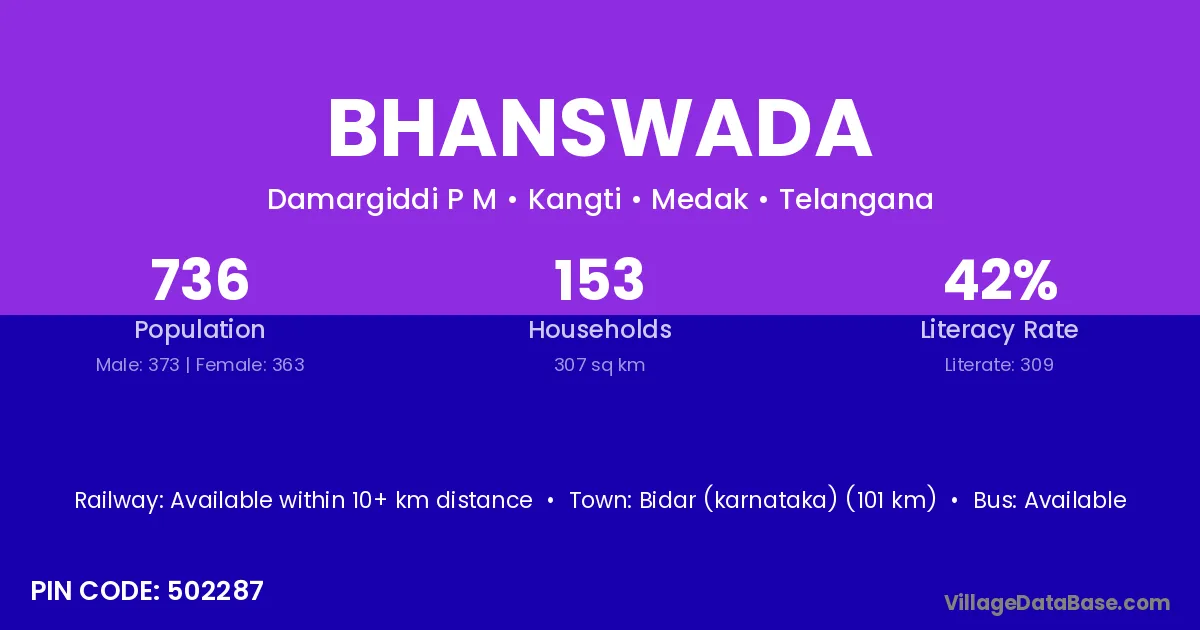 Bidar (karnataka) (101 km) is the nearest town to Bhanswada village for major economic activities and is located approximately 101 km away.
