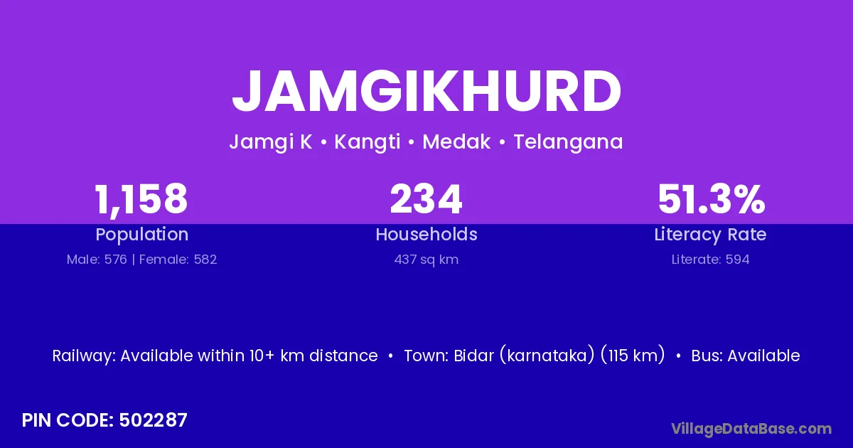 Bidar (karnataka) (115 km) is the nearest town to Jamgikhurd village for major economic activities and is located approximately 115 km away.