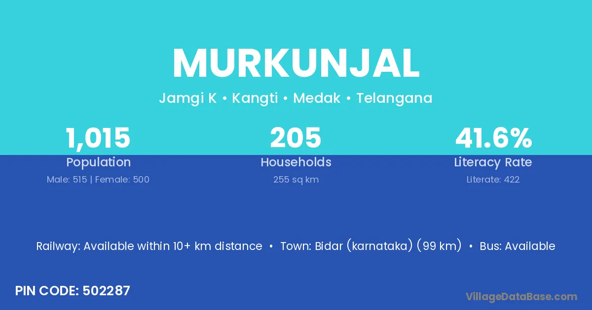 Bidar (karnataka) (99 km) is the nearest town to Murkunjal village for major economic activities and is located approximately 99 km away.