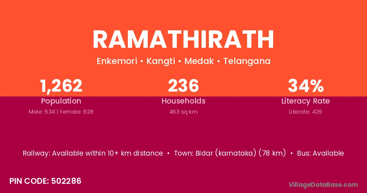 Bidar (karnataka) (78 km) is the nearest town to Ramathirath village for major economic activities and is located approximately 78 km away.