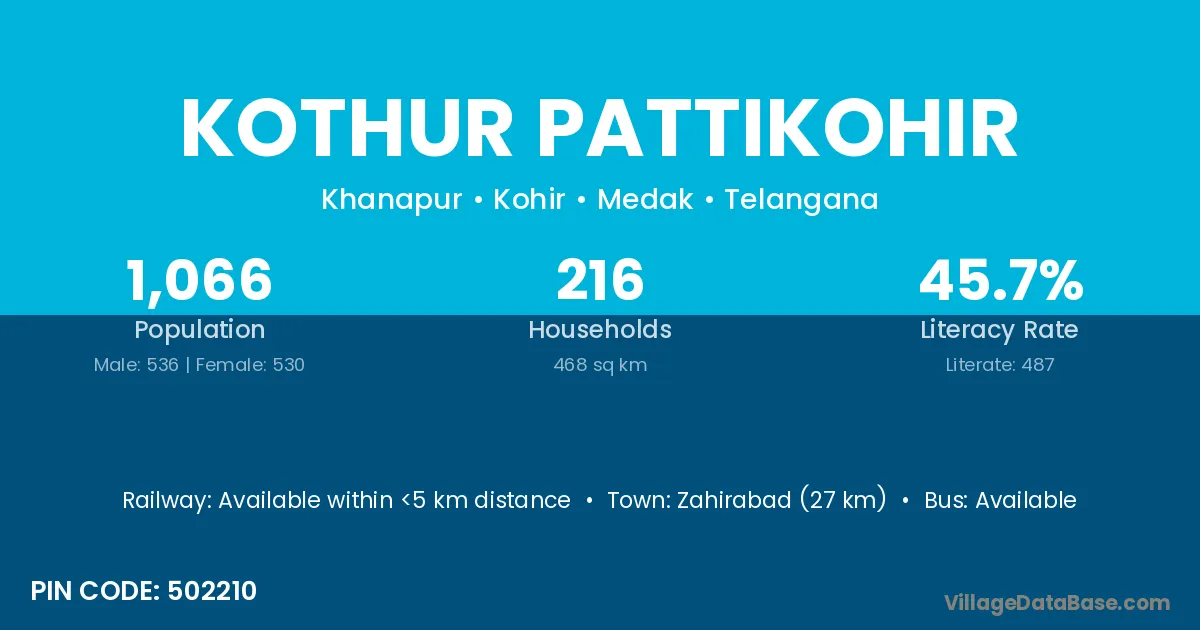 Zahirabad (27 km) is the nearest town to Kothur Pattikohir village for major economic activities and is located approximately 27 km away.