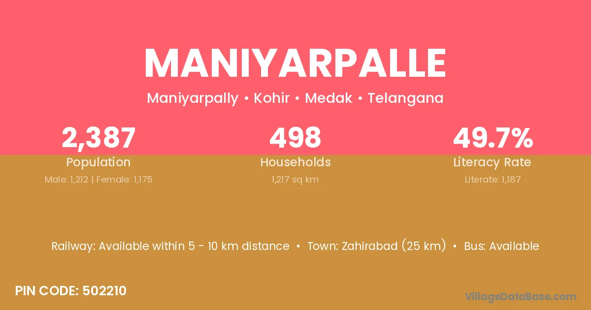 Zahirabad (25 km) is the nearest town to Maniyarpalle village for major economic activities and is located approximately 25 km away.