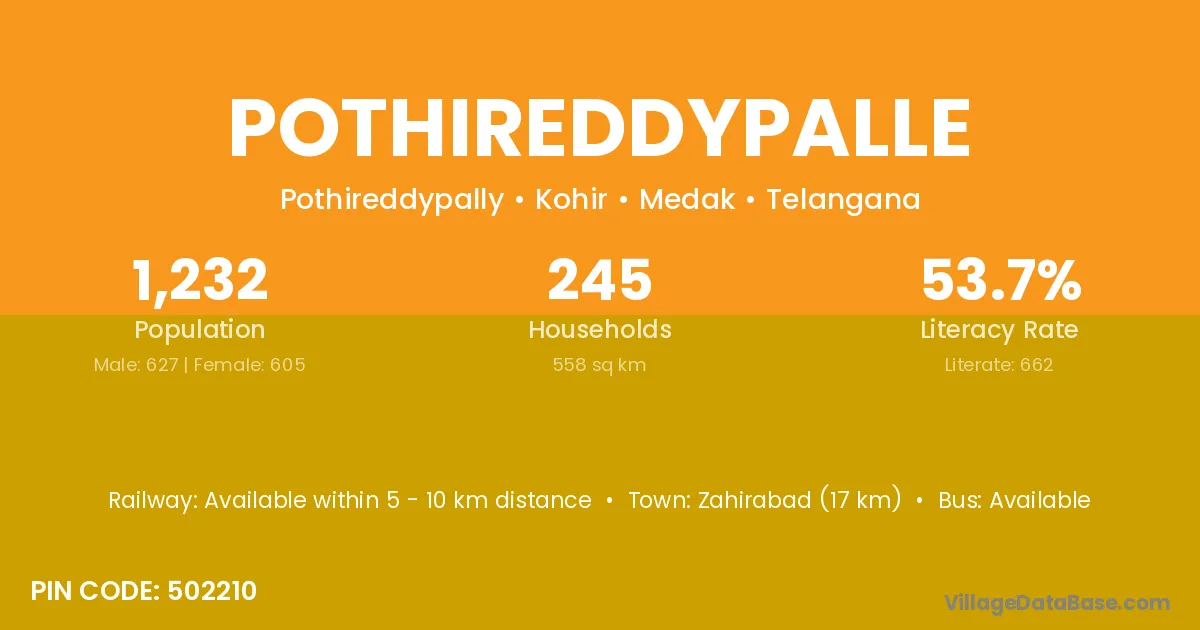 Zahirabad (17 km) is the nearest town to Pothireddypalle village for major economic activities and is located approximately 17 km away.