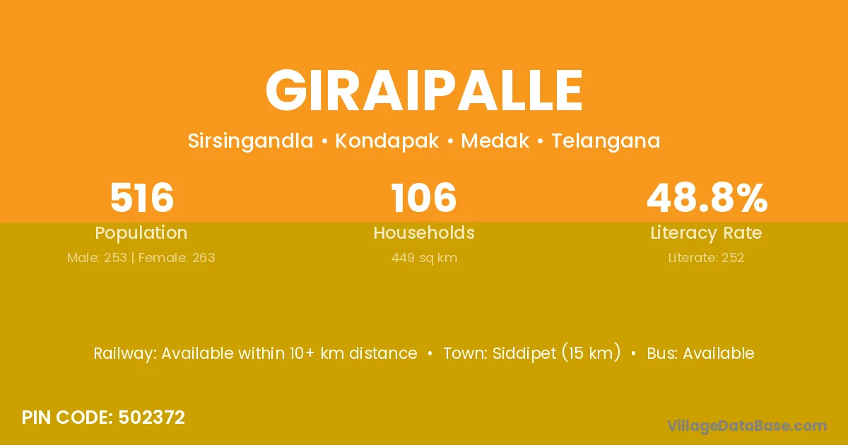 Giraipalle village has a total population of 516 people, of which 253 are males and 263 are females.