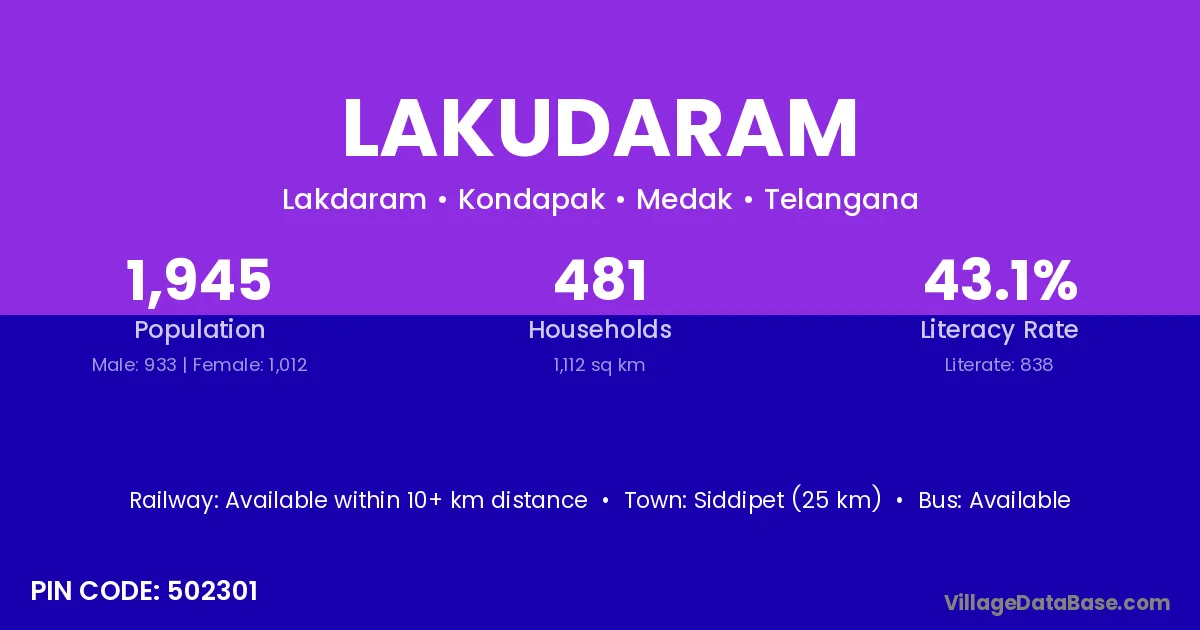 Siddipet (25 km) is the nearest town to Lakudaram village for major economic activities and is located approximately 25 km away.